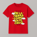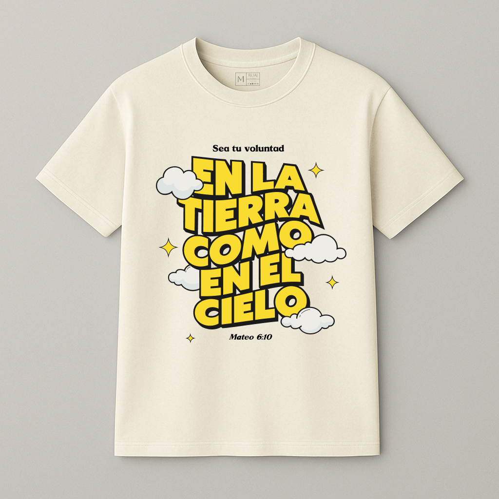 Camiseta premium 200 g en algodón peruano con el estampado “En la tierra como en el cielo”. Suave al tacto, respirable y duradera. Ideal para uso diario.