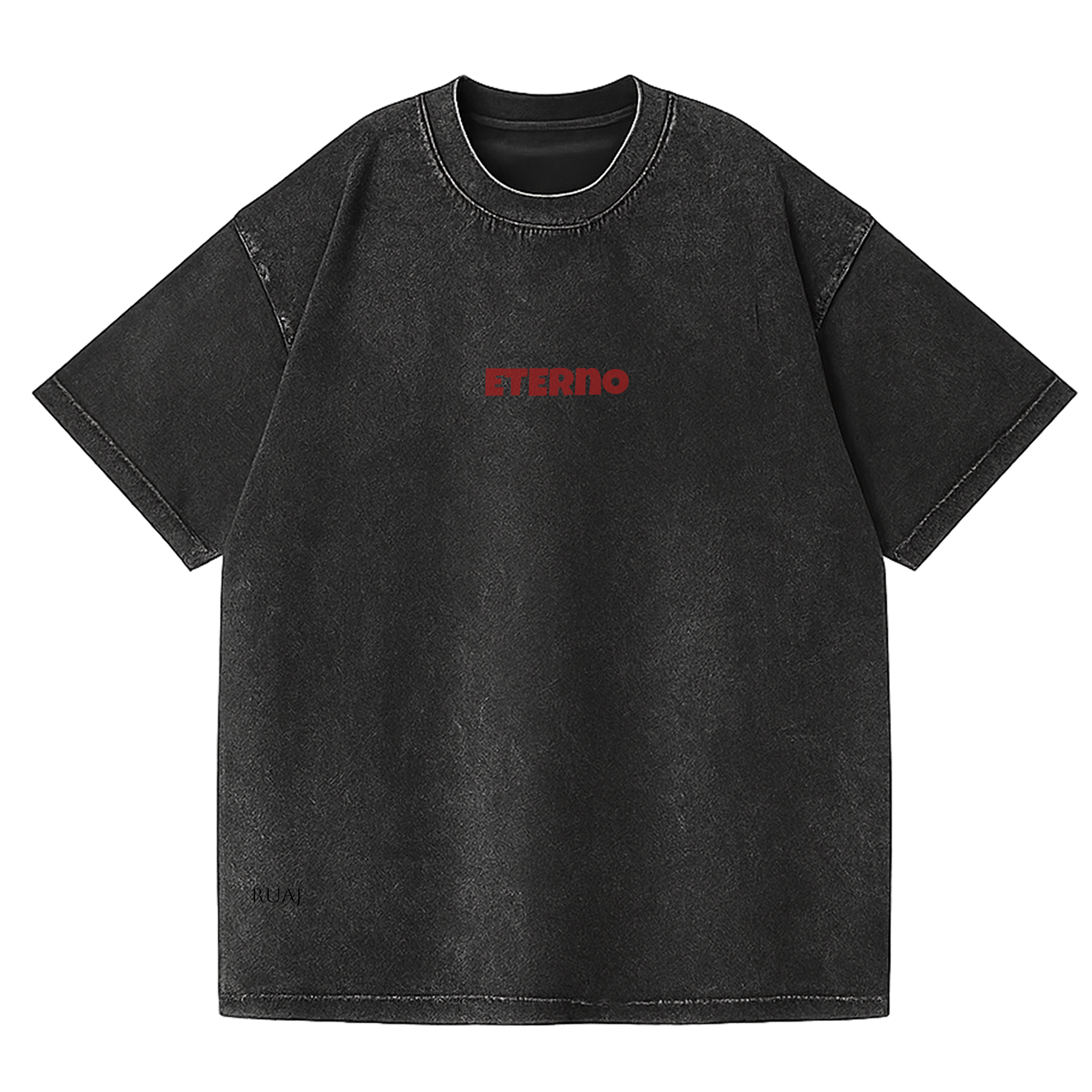 Corte oversize unisex, tejido pesado 100% algodón (≈200 g), lavado tipo mineral-wash negro.