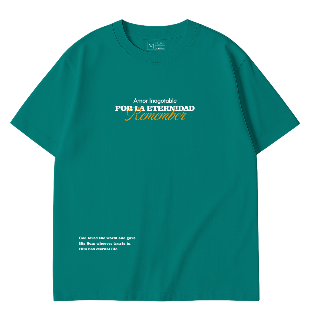 “Amor Inagotable — Por la Eternidad”. Camiseta oversize unisex con mensaje de fe inspirado en Juan 3:16. Mini print frontal y texto inspirador; ideal para vestir tu fe o para regalar.
