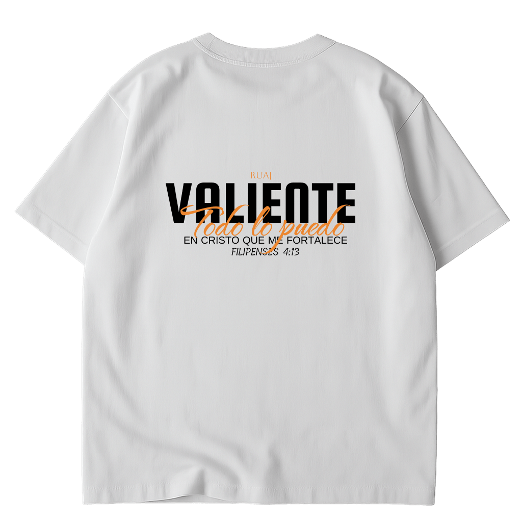 Sé VALIENTE. Camiseta oversize unisex con mensaje de fe inspirado en Filipenses 4:13: “Todo lo puedo en Cristo que me fortalece”. Tejido suave y resistente, ideal para uso diario o como regalo con propósito.